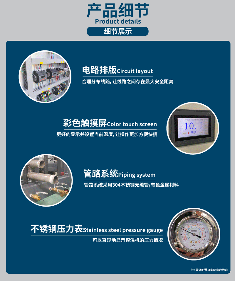 注塑模具模溫機(jī)配備高效的加熱元件,能夠快速達(dá)到所需的工作溫度,并具有快速的溫度響應(yīng)能力。設(shè)備采用智能溫度控制系統(tǒng),能夠**地控制模具的溫度,確保在整個注塑過程中保持穩(wěn)定的溫度。